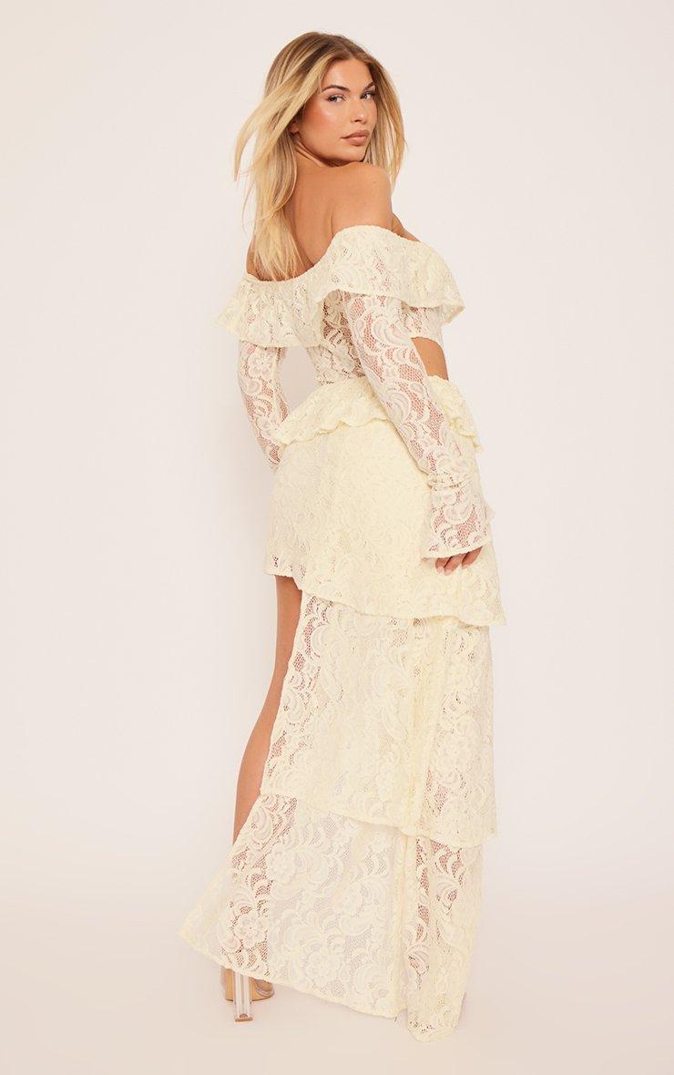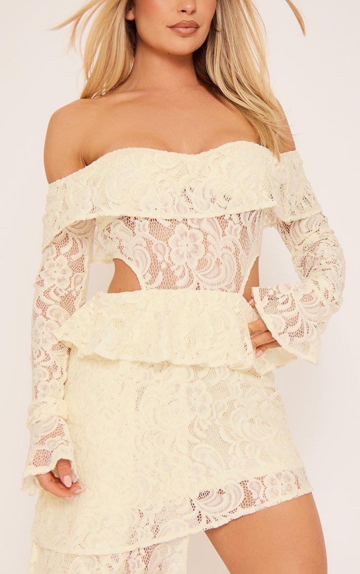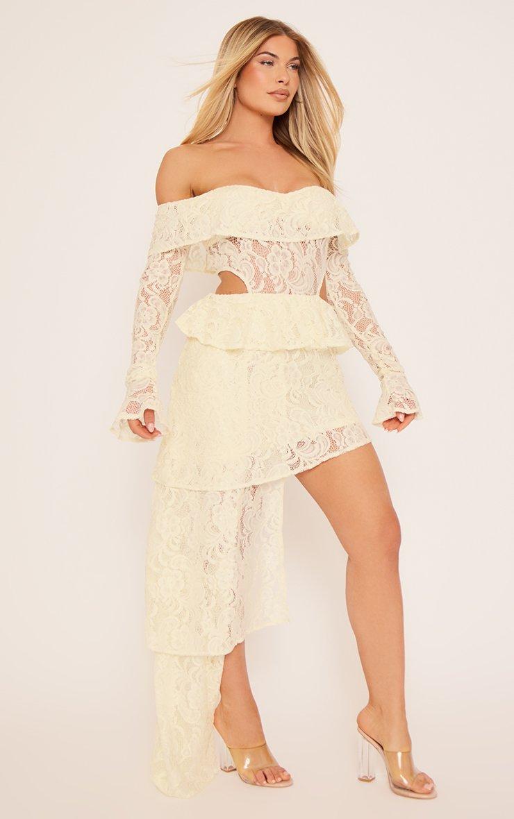 Lace Bardot Flute Sleeve Asymmetric Drape Detail Mini Dress In Cream Lace