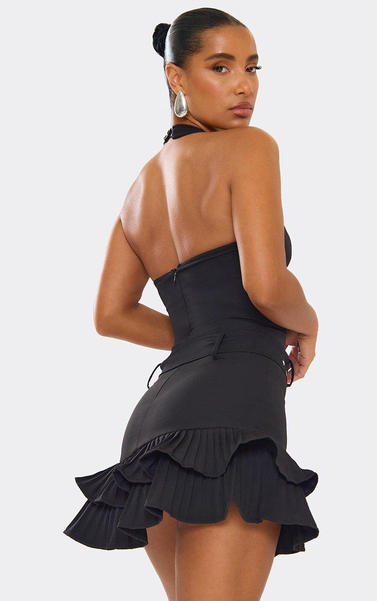 Halterneck Belt Detail Pleated Hem Mini Dress In Black