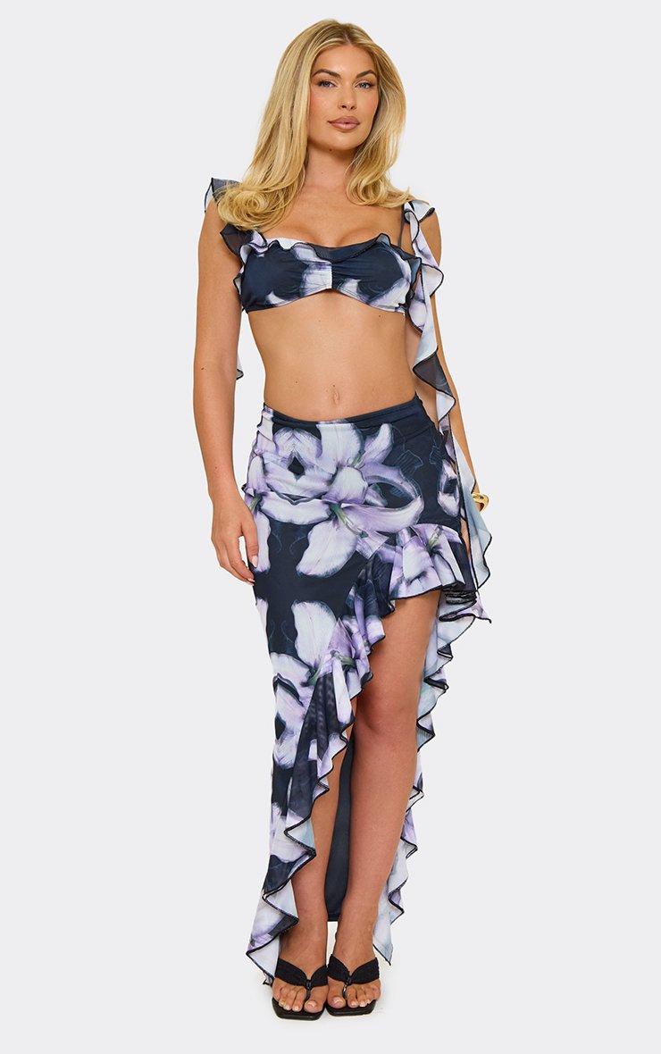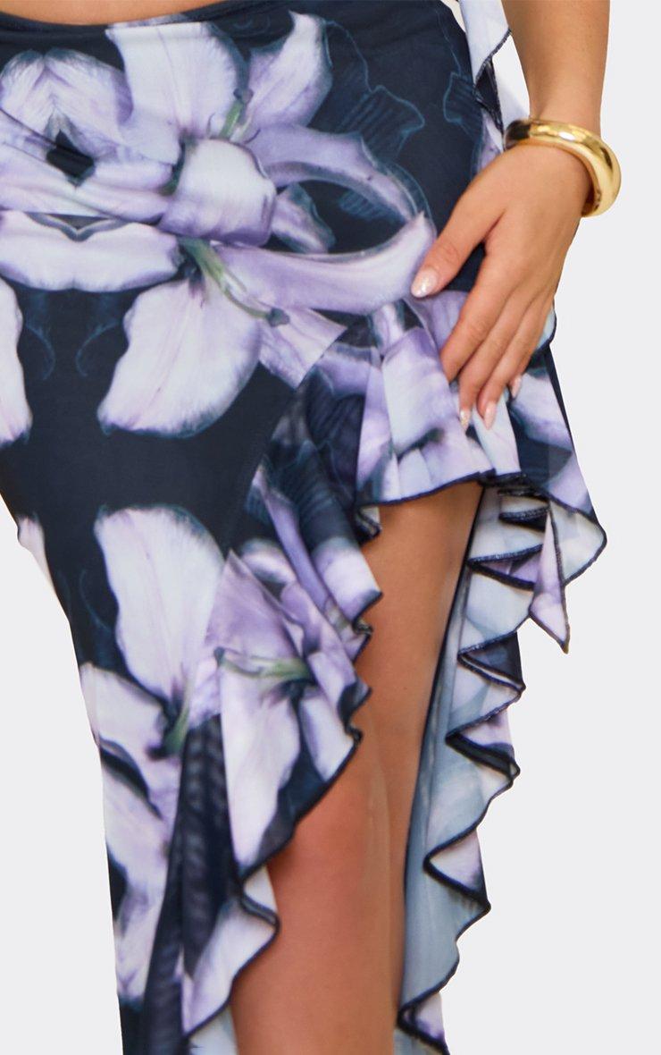 Mid Rise Frill Hem Side Split Maxi Skirt In Lilac Floral Print