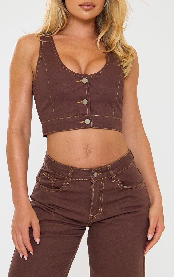 V Neck Button Down Seam Detail Crop Top In Brown Denim