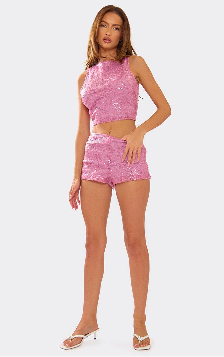 Low Rise Drape Front Detail Hot Pants In Pink Sequin