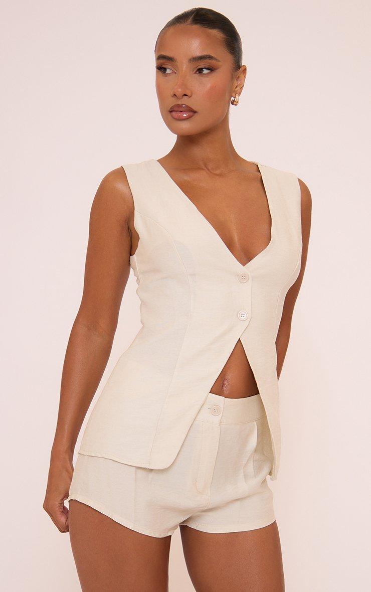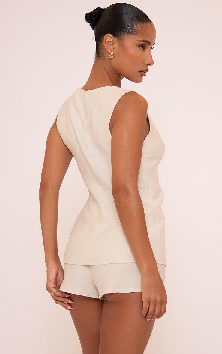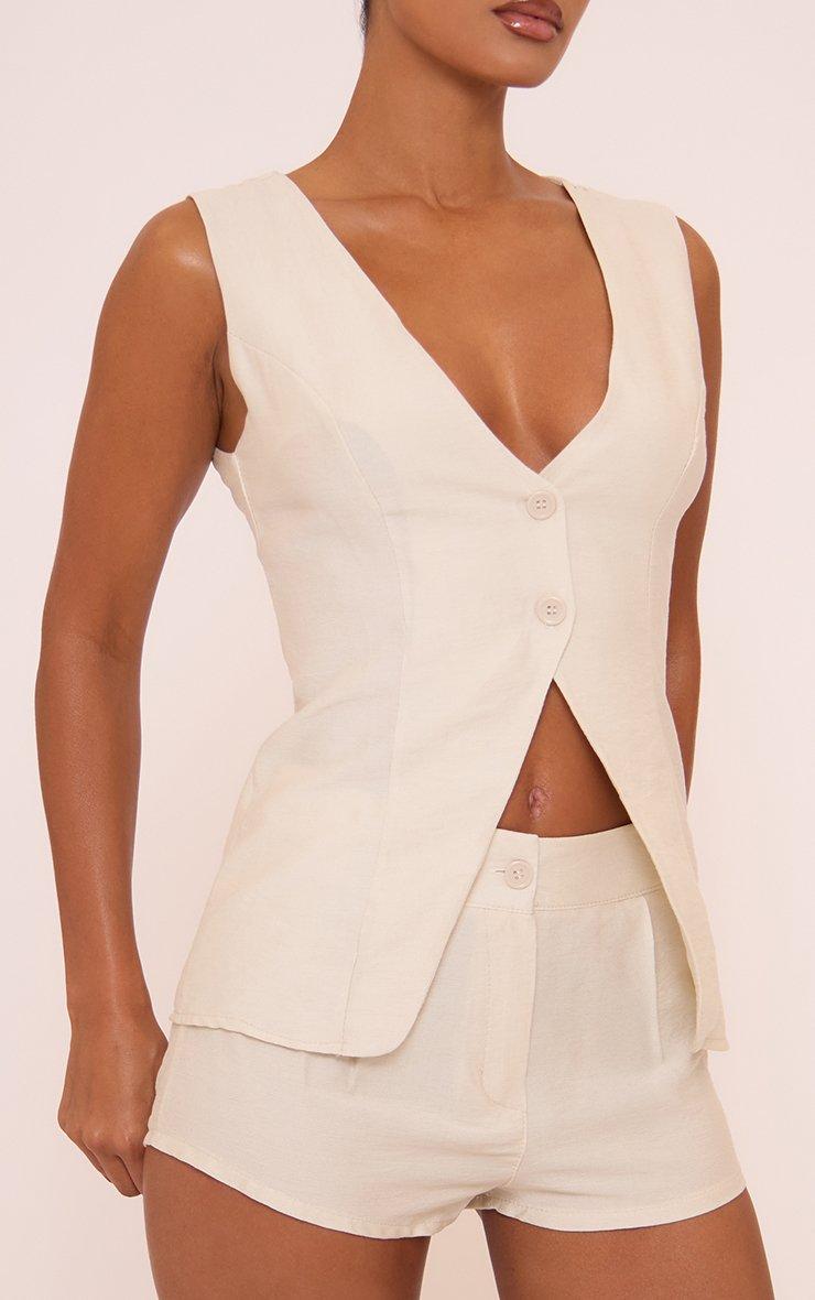 Plunge Button Front Tie Back Waistcoat In Stone Linen