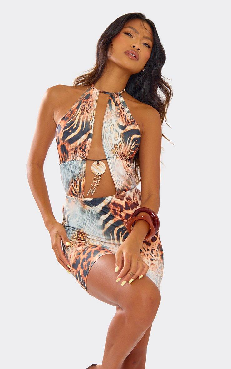 Halterneck Strap Front Trim Detail Mini Dress In Multi Animal Printed