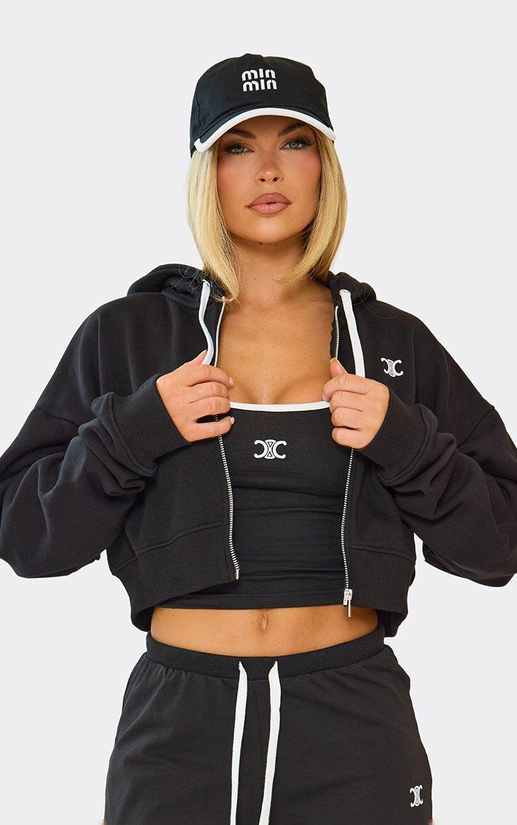 Long Sleeve Graphic Detail Zip Up Cropped Hoodie In Black