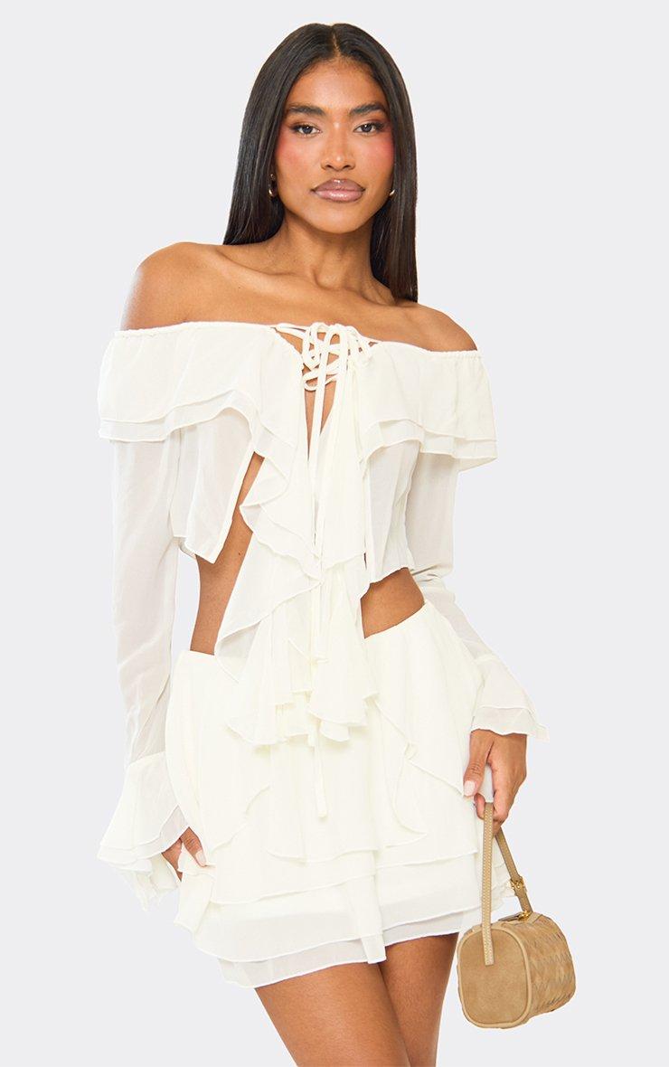 Low Rise Frill Detail Layered Mini Skirt In Cream Lace