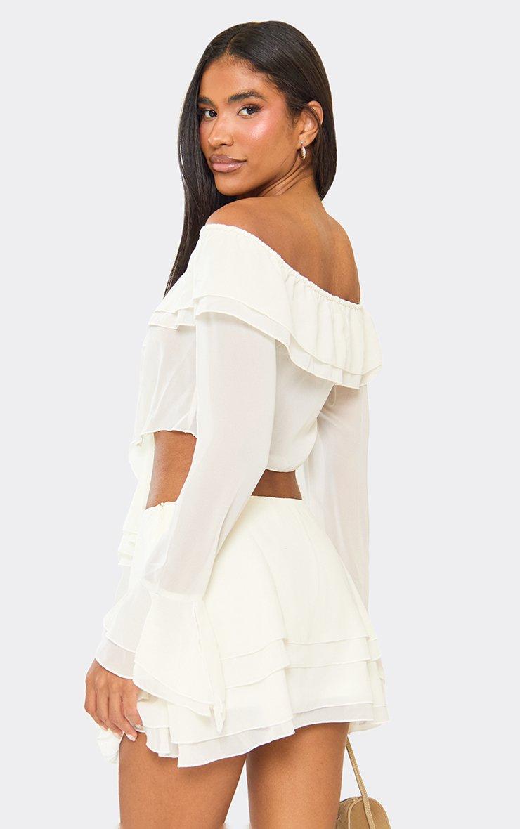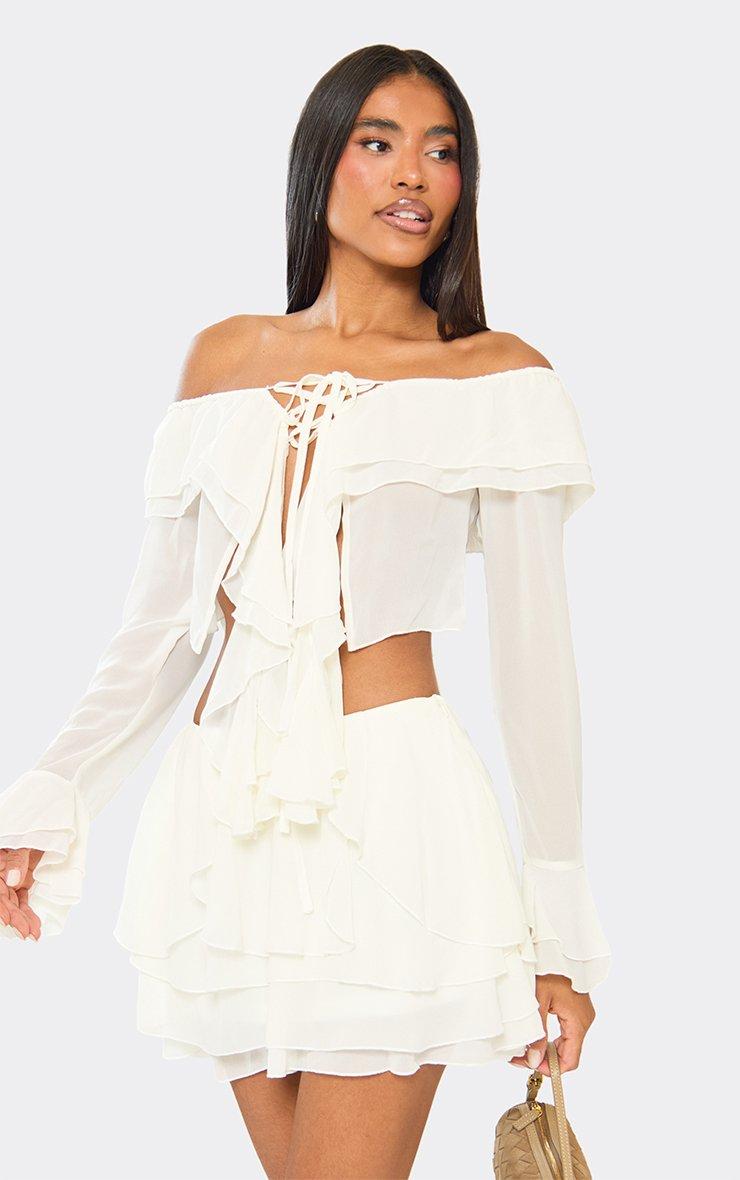 Off The Shoulder Flared Sleeve Tie Front Detail Top In Cream