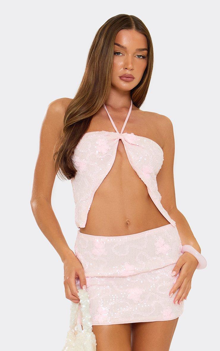 Halterneck Split Hem Front Detail Top In Pink Sequin