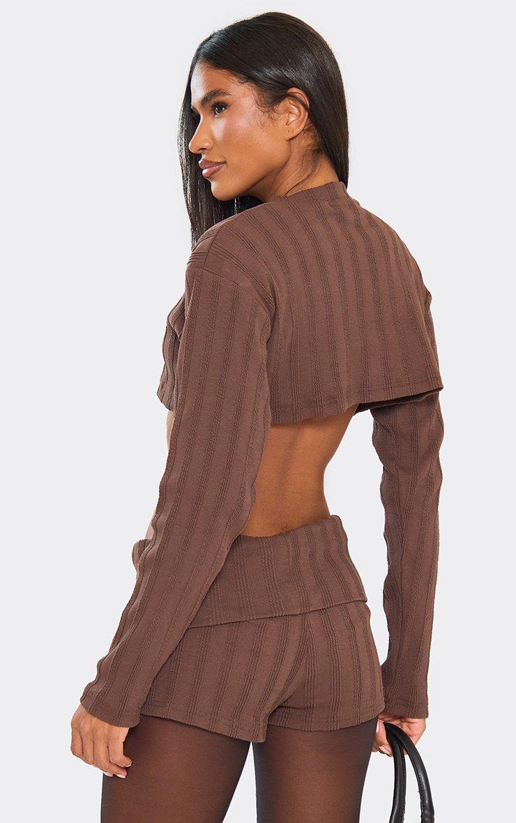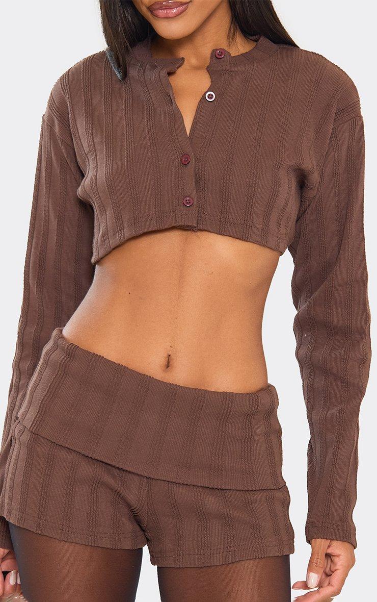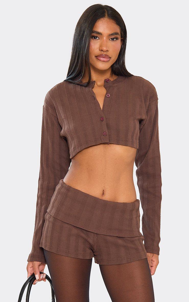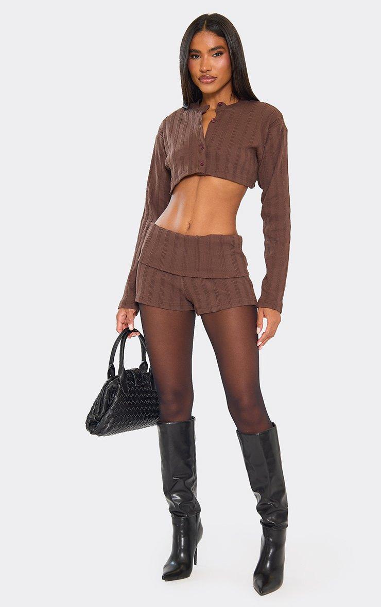 Long Sleeve Button Up Cropped Cardigan In Brown Ribbed