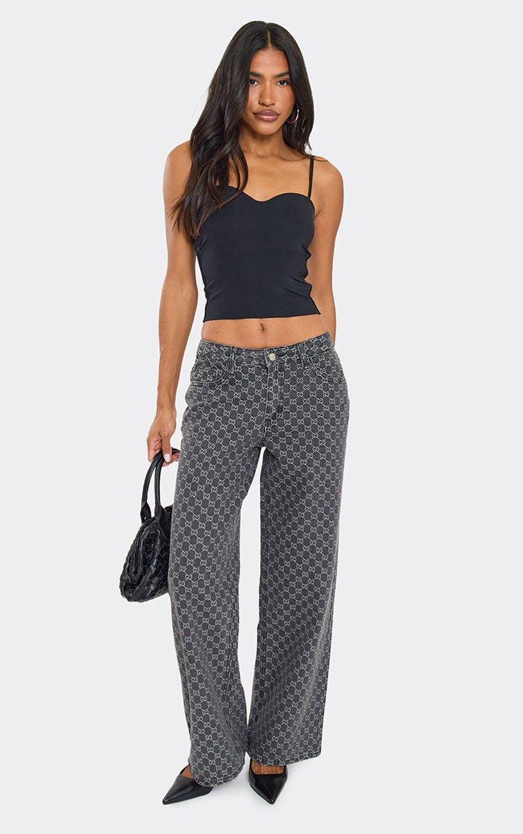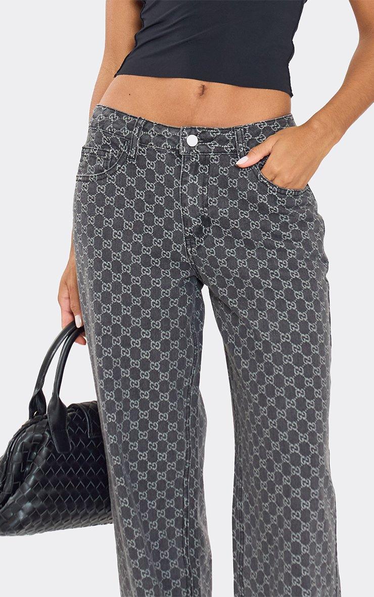 Low Rise Frayed Edge Side Slogan Wide Leg Jeans In Black Denim