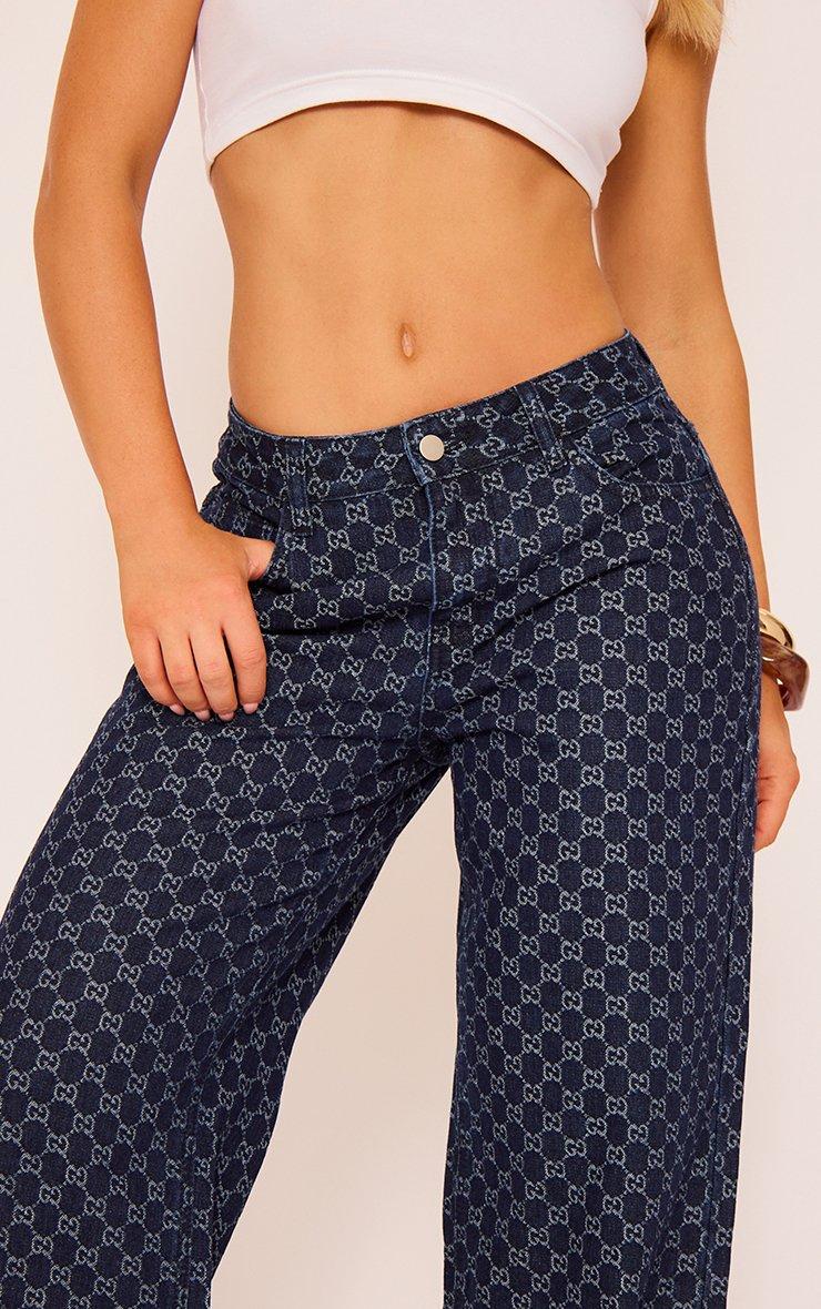 Low Rise Logo Detail Wide Leg Jeans In Indigo Blue Denim