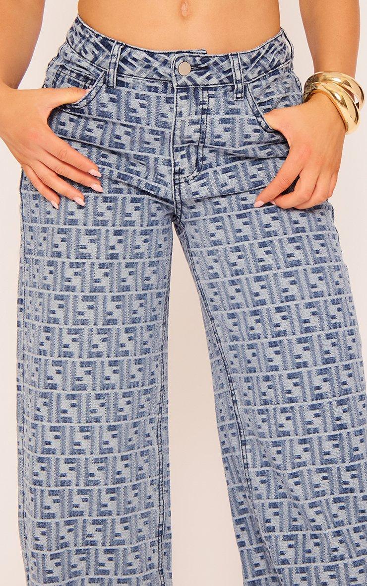 Low Rise Frayed Edge Side Slogan Wide Leg Jeans In Blue Denim