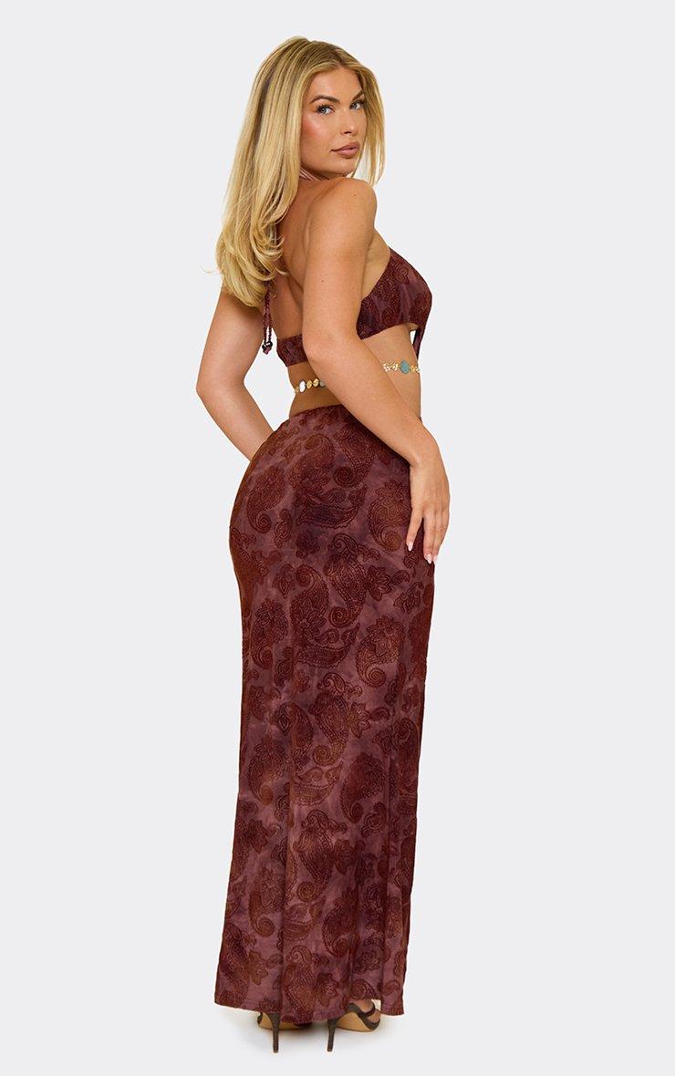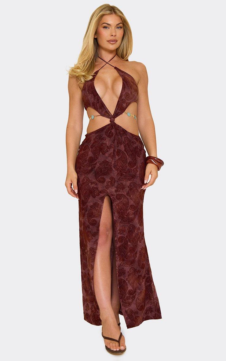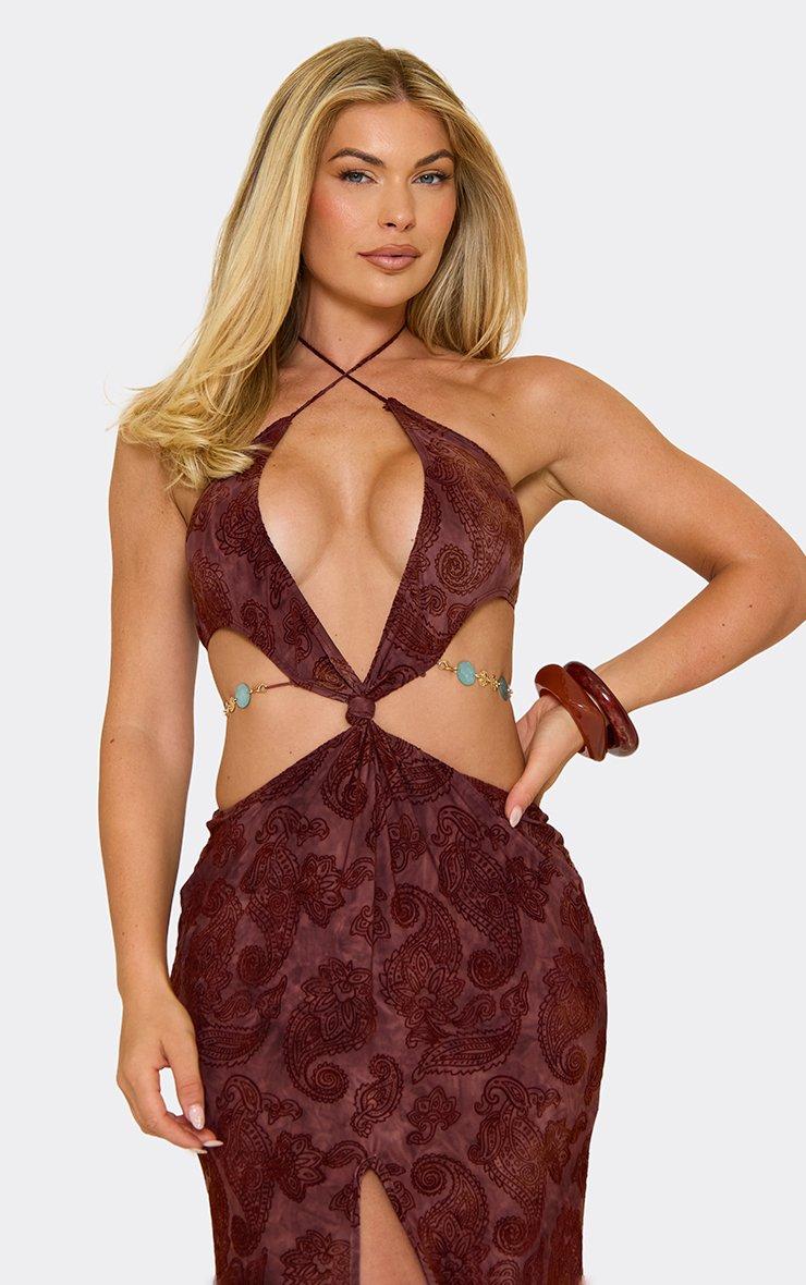 Cross Strap Halterneck Beaded Trim Cut Out Maxi Dress In Chocolate Devore