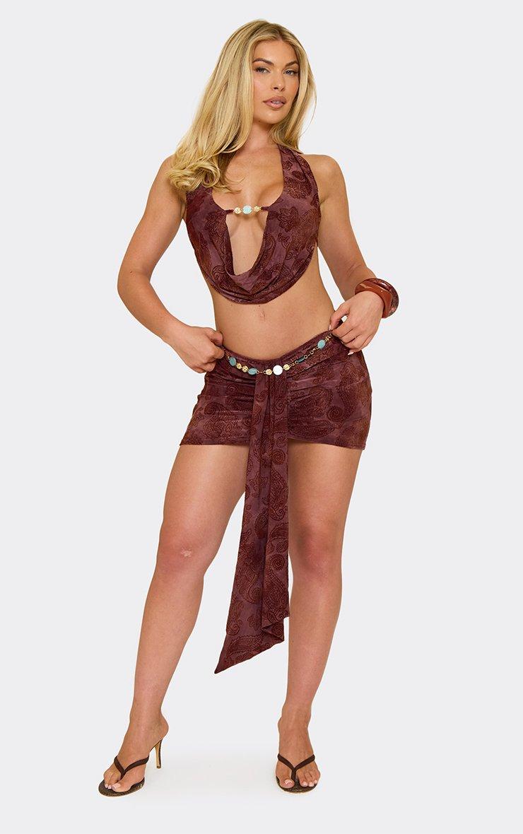 mid rise beaded trim draped front mini skirt in chocolate devore