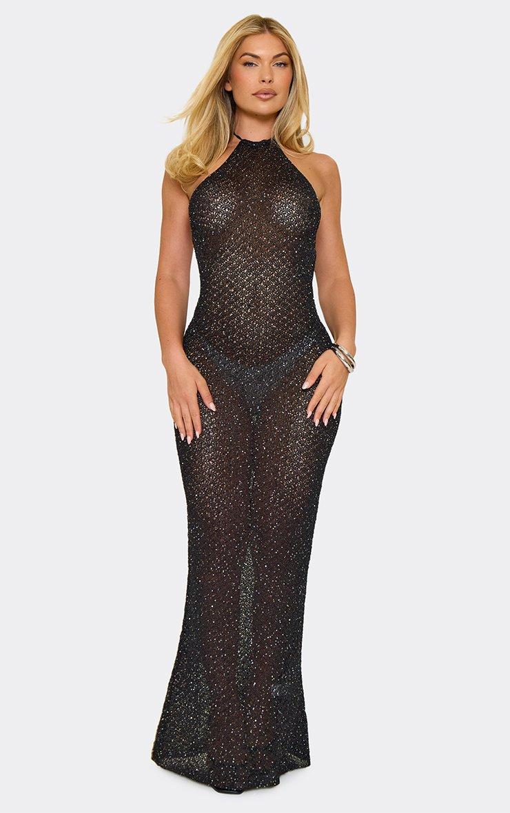 Halterneck Low Back Maxi Dress In Black Metallic Knit