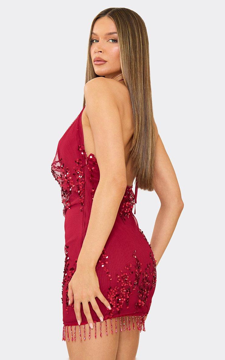 Halterneck Low Back Eyelet Belt Mini Dress In Burgundy