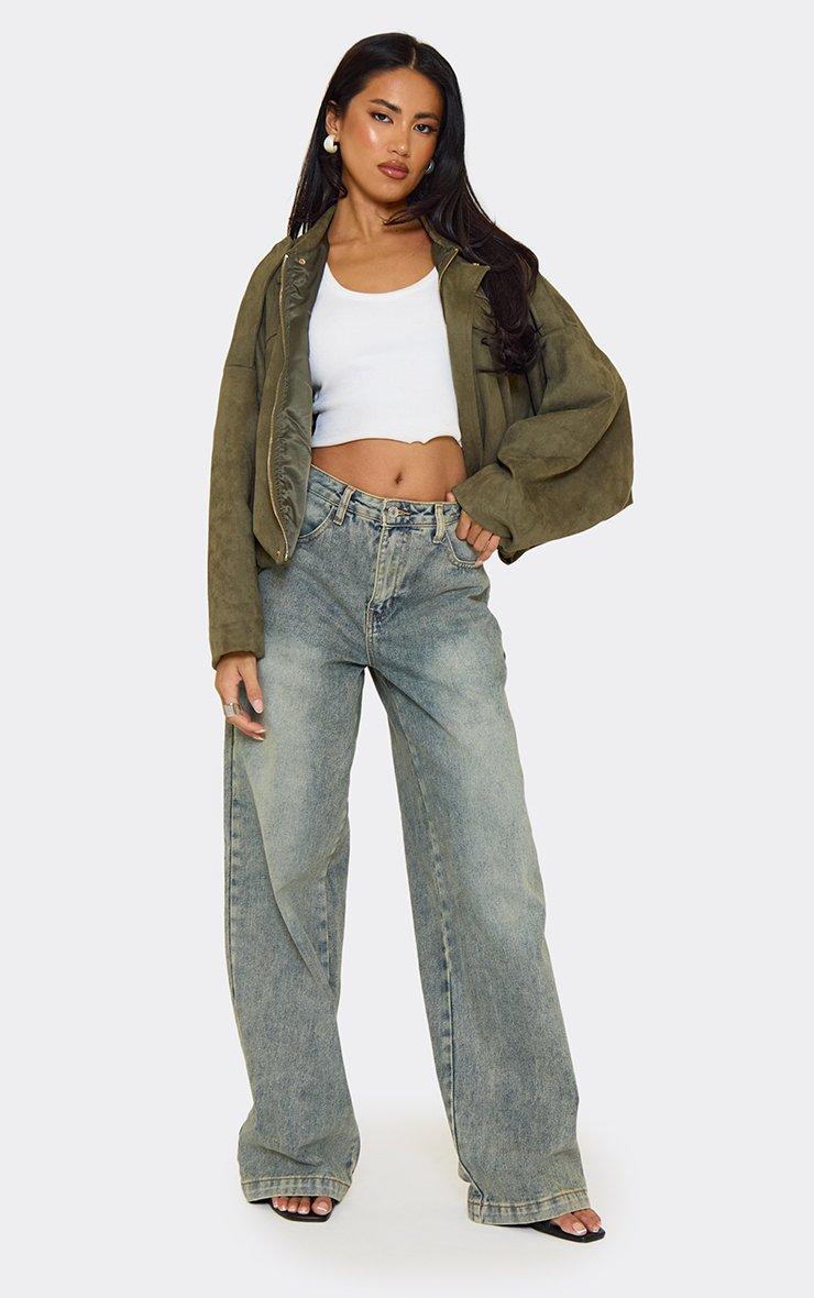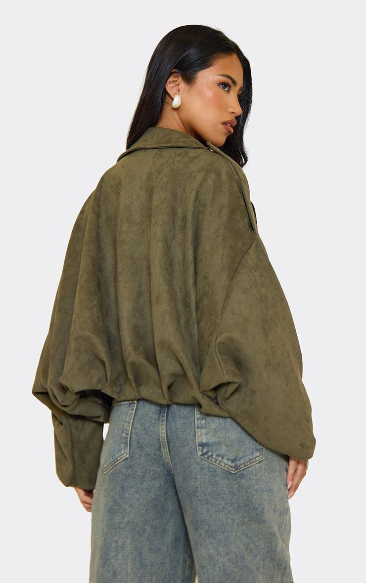 Long Sleeve Oversized Padded Crop Bomber Jacket In Khaki Green