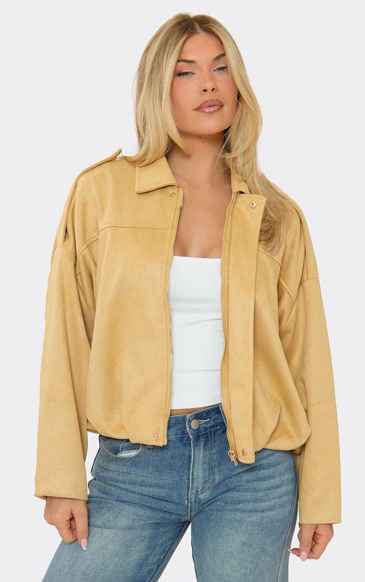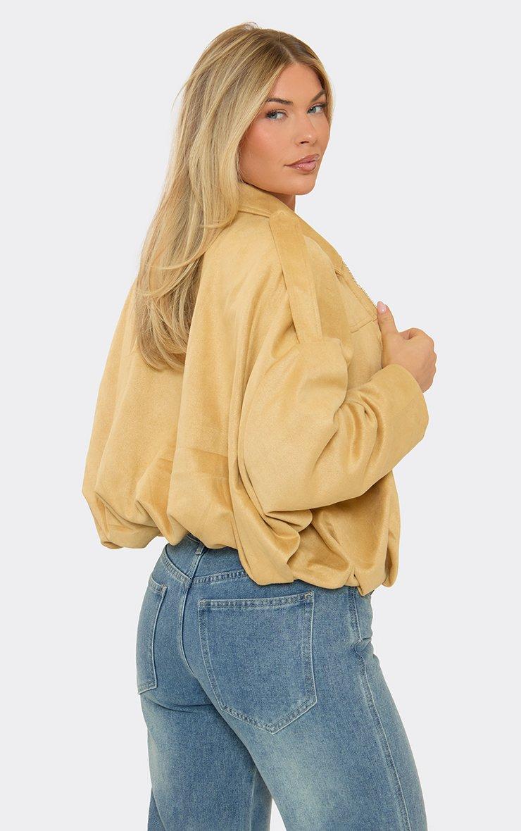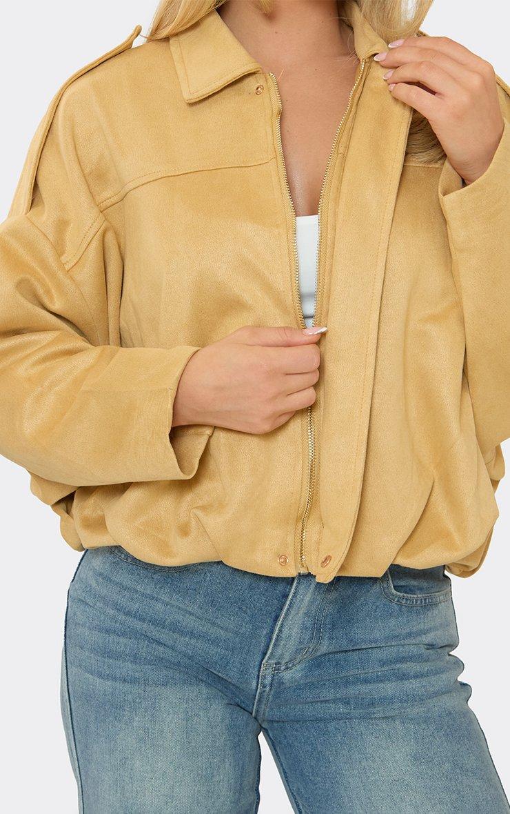 Long Sleeved Zip Front Collared Detail Bomber Jacket In Mustard Faux Suede