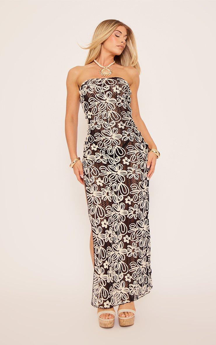Bandeau Split Leg Embroidered Floral Maxi Dress In Black Textured