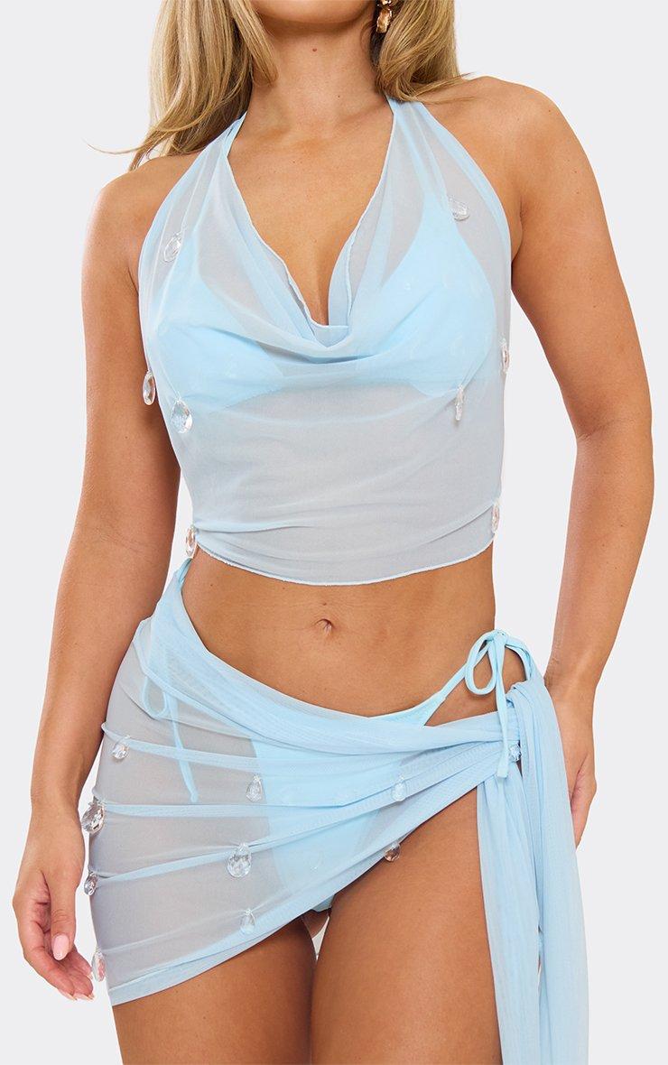 Halterneck Beaded Cut Out Mini Dress In Green Textured