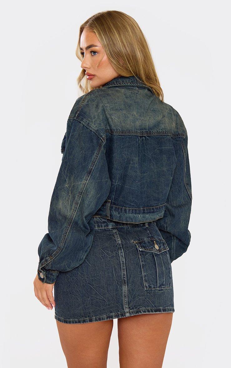 Long Cuffed Sleeve Zip Up Front Cropped Jacket In Indigo Denim