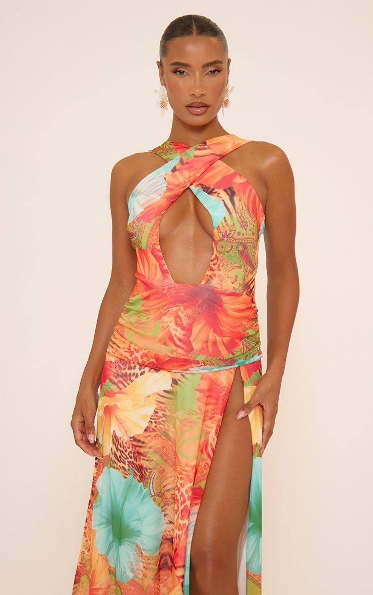 cross strap cut out split front detail maxi dress in orange printed