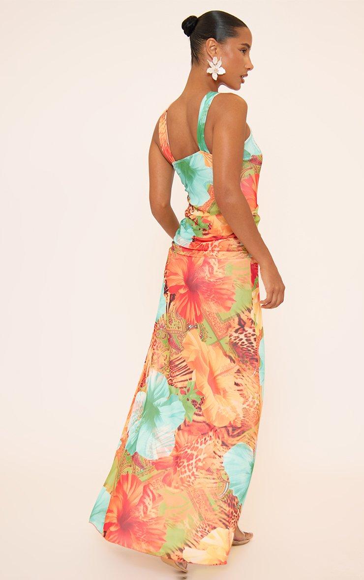 Cross Strap Cut Out Split Front Detail Maxi Dress In Orange Printed