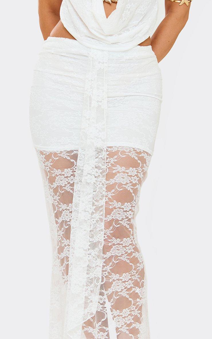 Mid Rise Drape Front Detail Maxi Skirt In White Lace