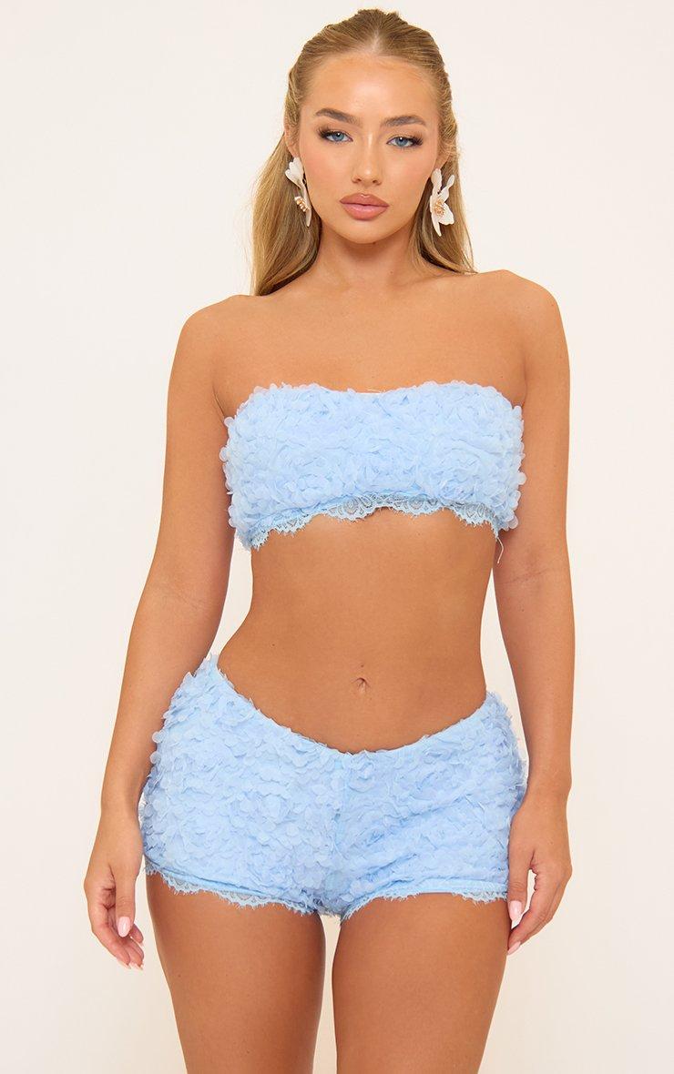 Bandeau Lace Trim Crop Top And Hot Pants Co-Ord Set In Blue Lace
