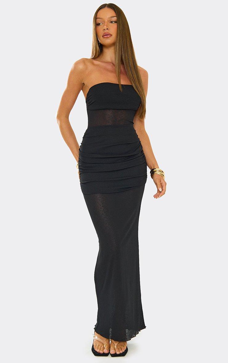 Bandeau Overlay Panel Detail Maxi Dress In Black Mesh