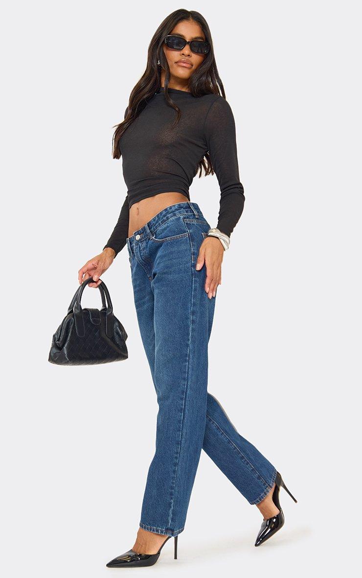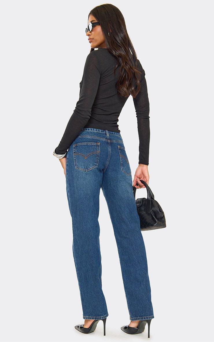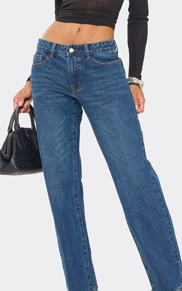 Low Rise Waist Straight Leg Jeans In Mid Blue Wash Denim