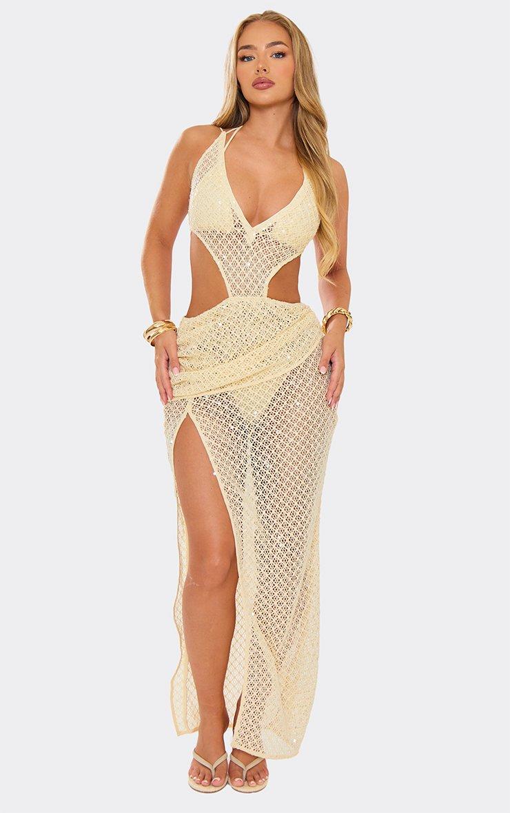 halterneck cut out side split detail maxi dress in yellow textured sequin