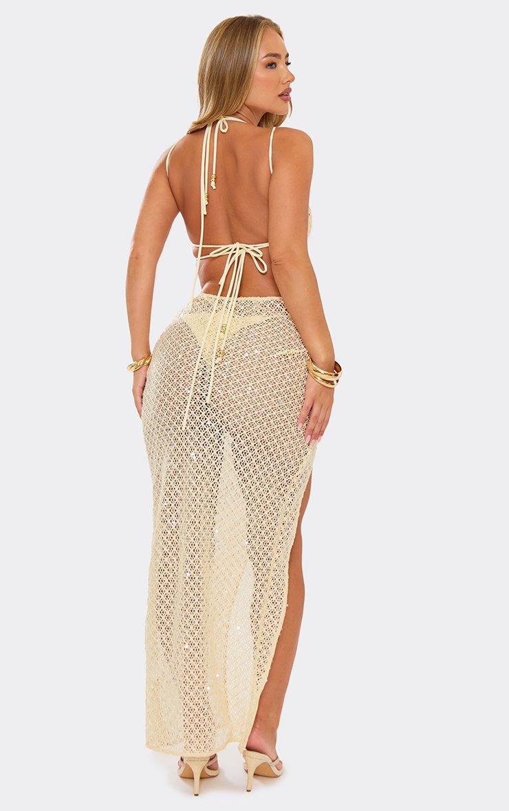 Chunky Beaded Detail Split Leg Maxi Skirt In Cream