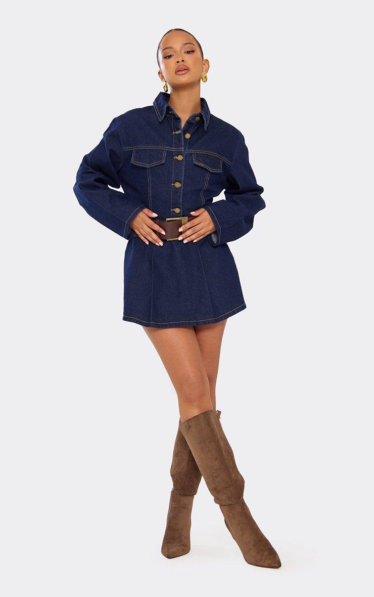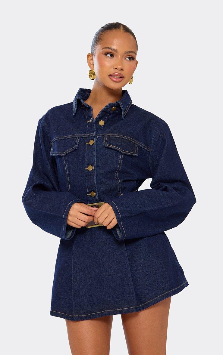Long Sleeve Belted Button Down Mini Dress In Indigo Blue Denim
