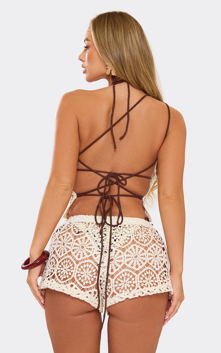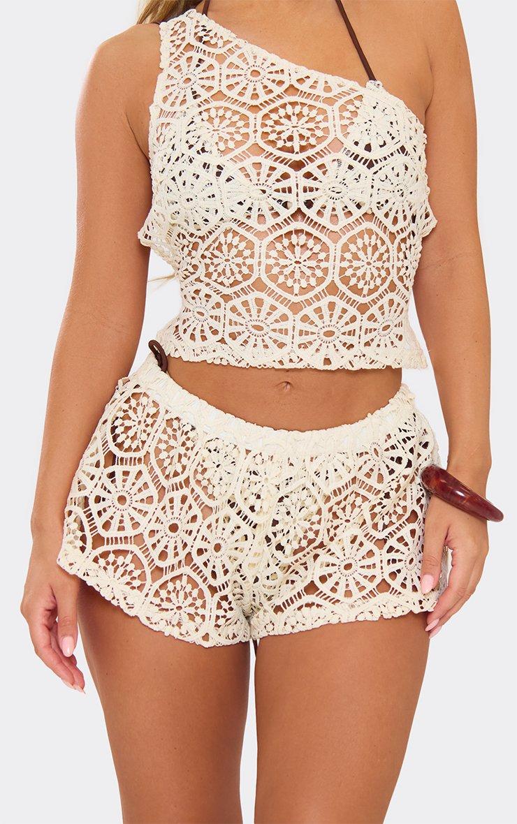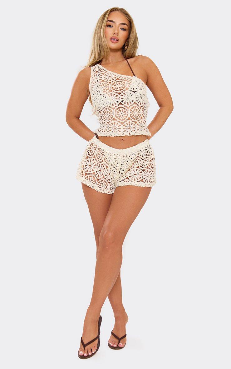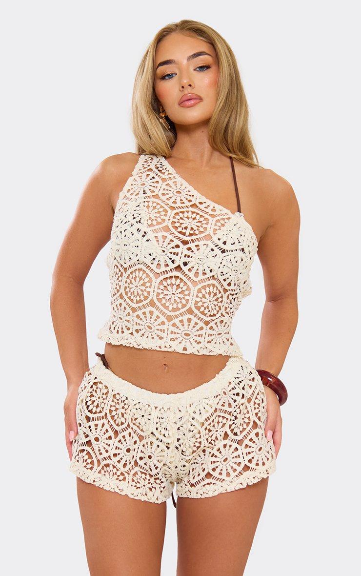 One Shoulder Lace Up Back Detail Beach Top In Cream Crochet