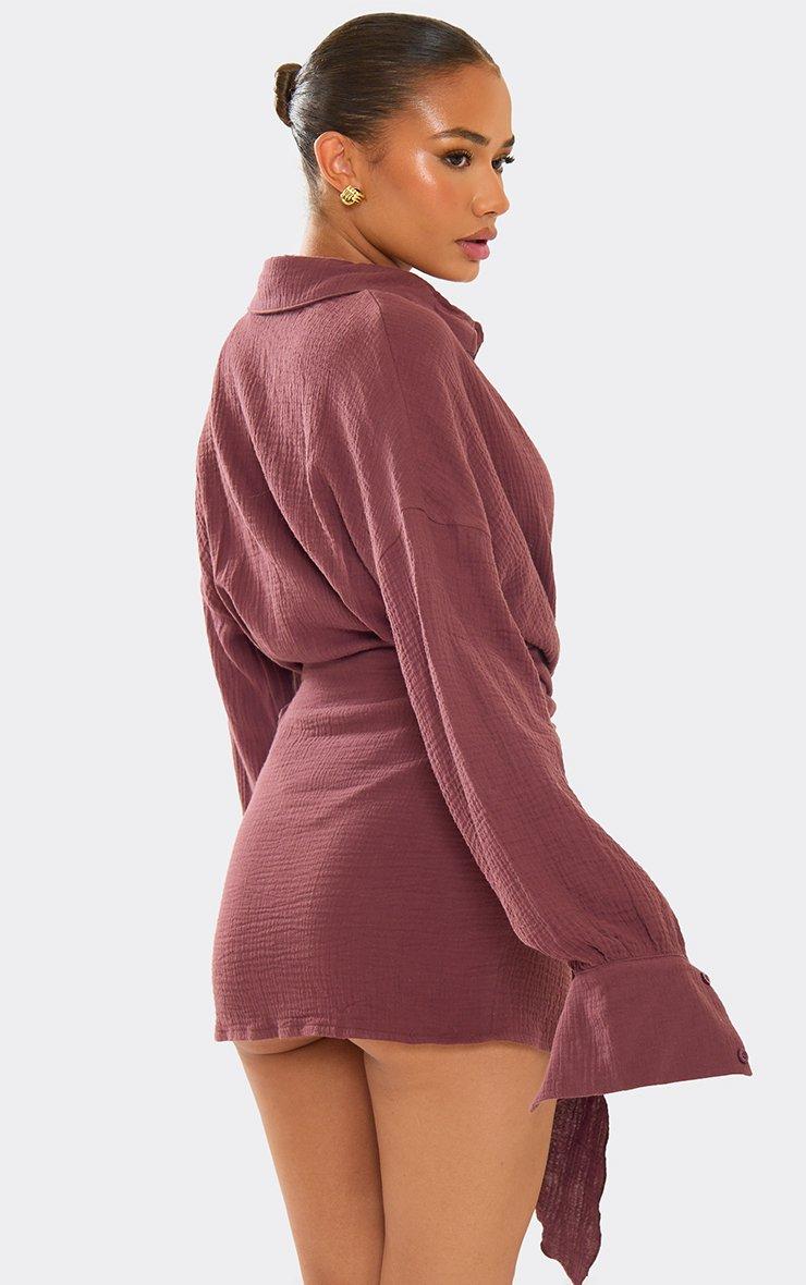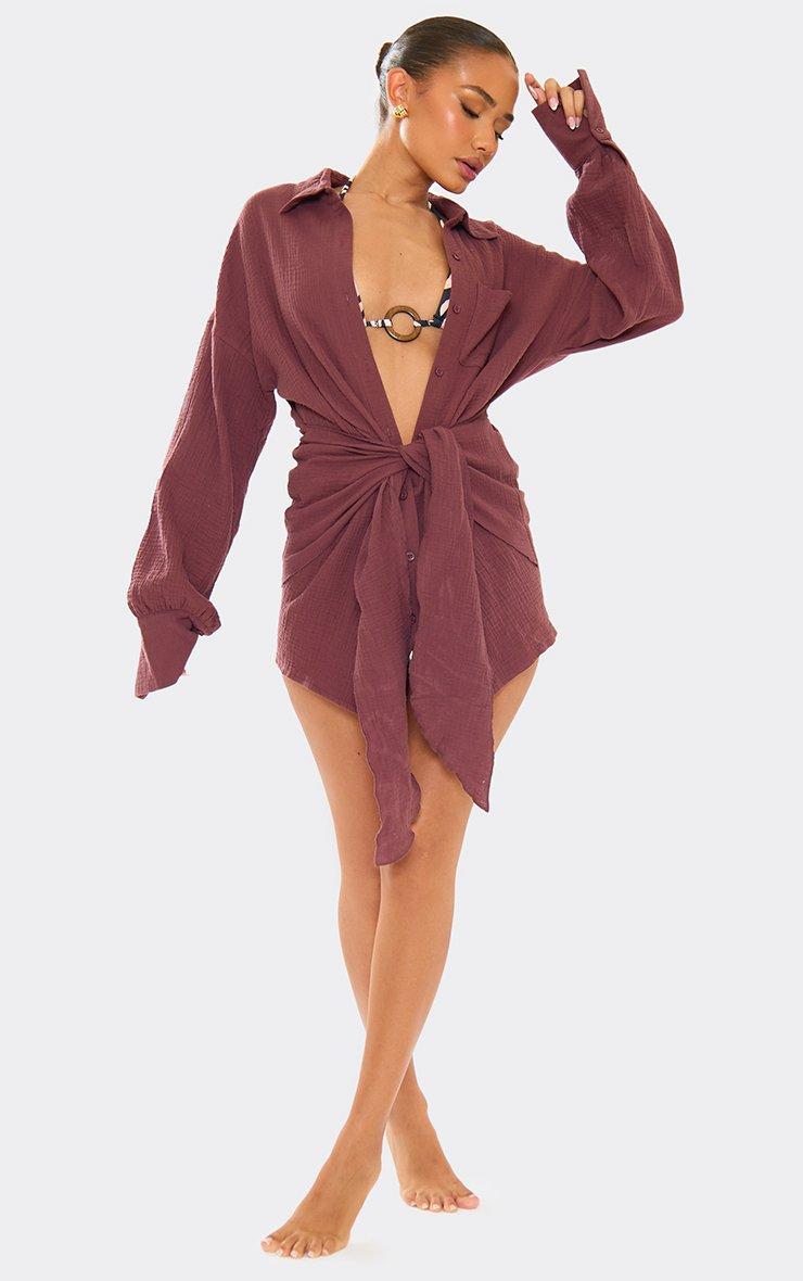 Long Sleeve Wrap Front Beach Dress In Brown Cheesecloth