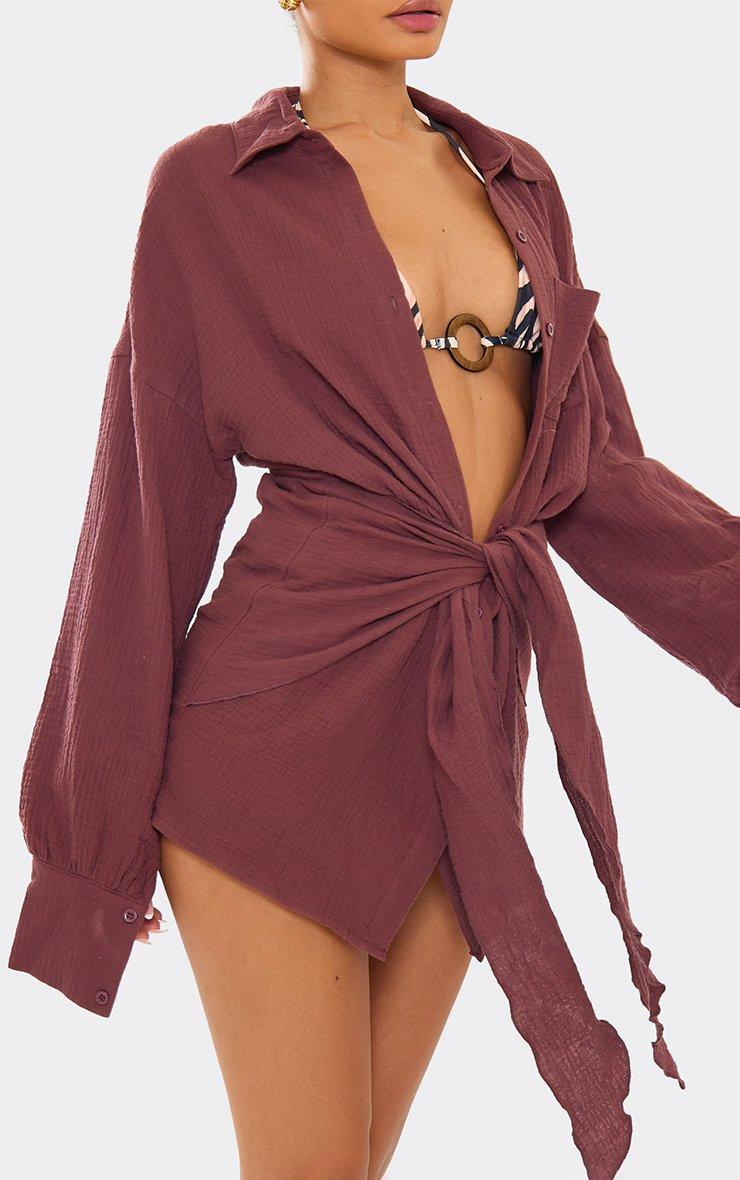 long sleeve wrap front beach dress in brown cheesecloth