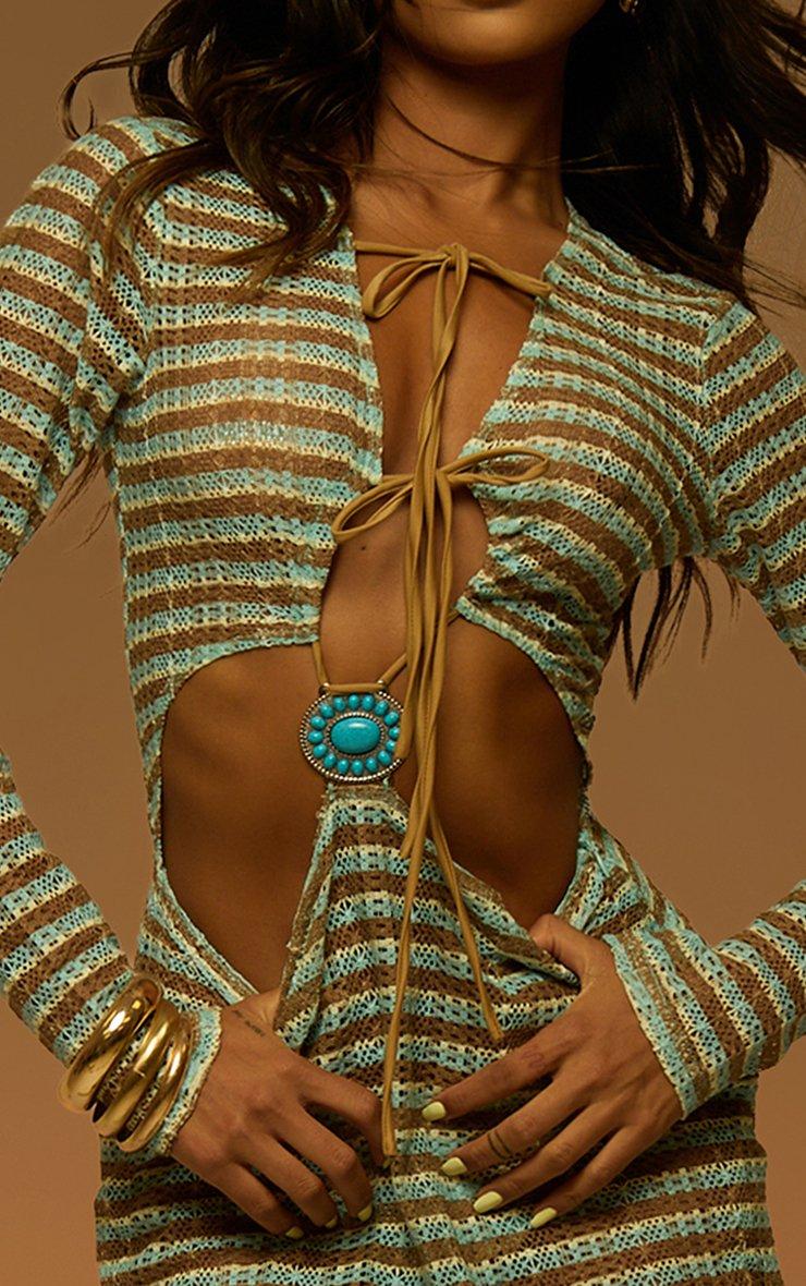 long sleeve cut out trim detail beach mini dress in brown stripe crochet