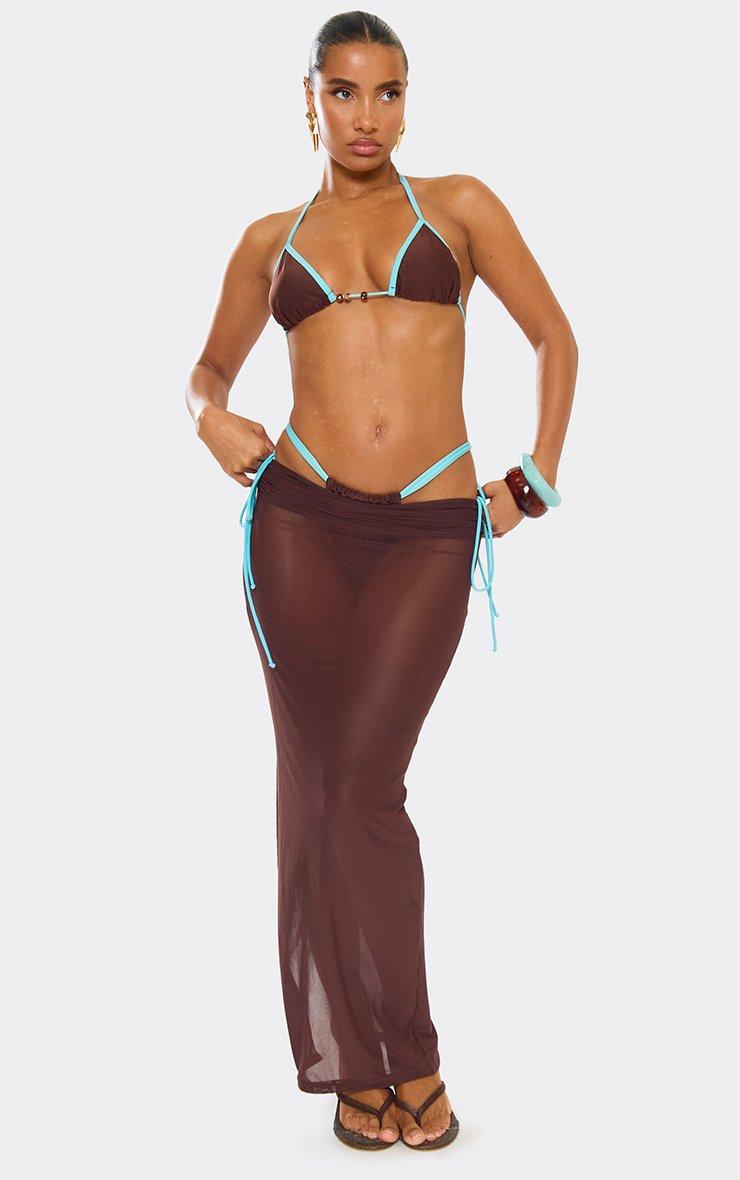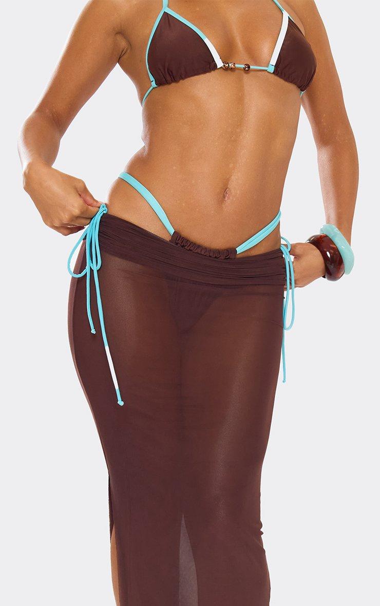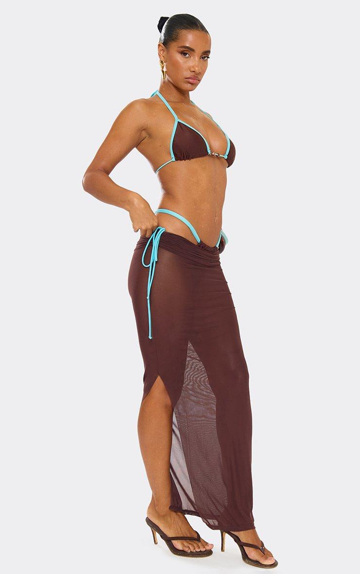 Mid Rise Split Leg Ruched Contrast Tie Detail Maxi Skirt In Brown Mesh