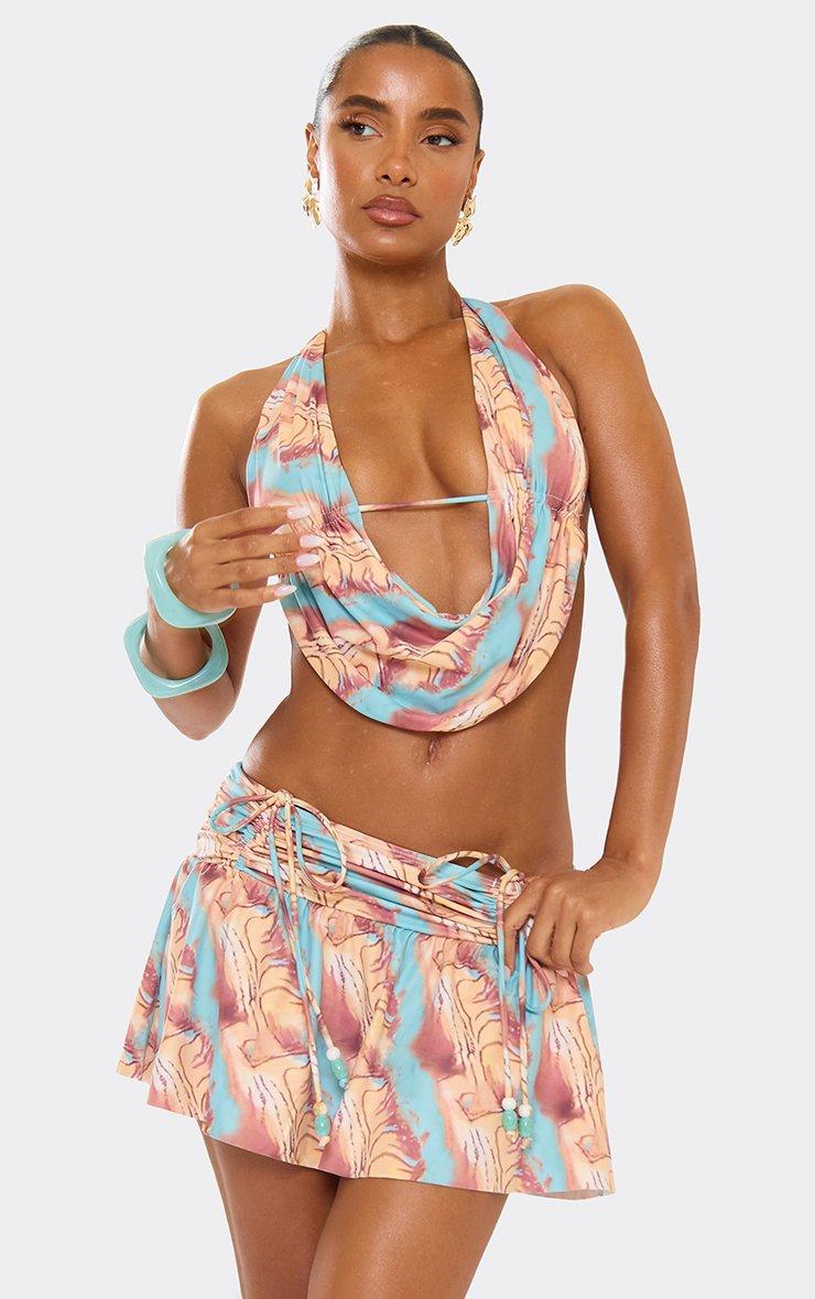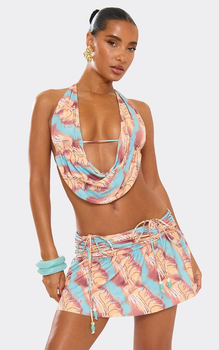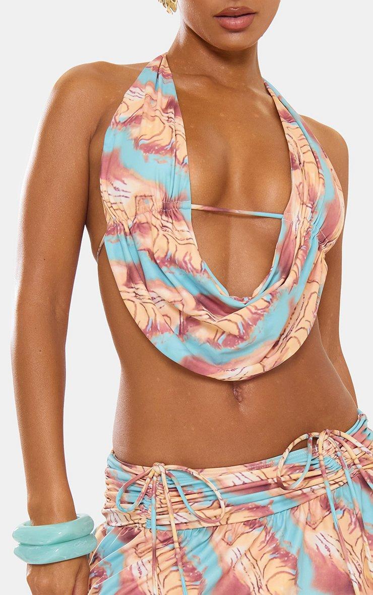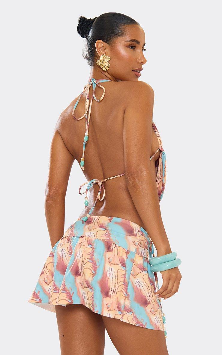 Halterneck Beaded Bikini Beach Top In Multi Abstract Print