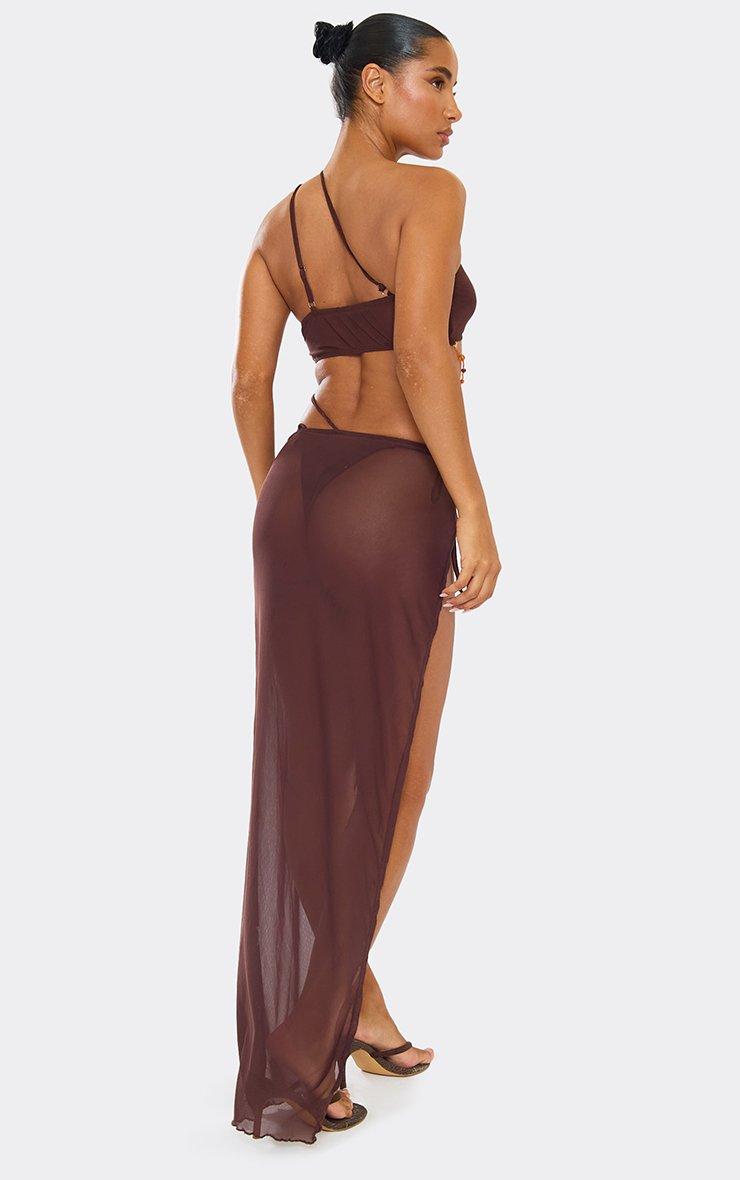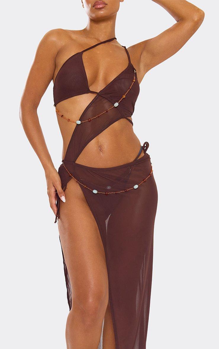 Multi Draped Bead Detail Split Leg Maxi Beach Dress In Brown Mesh