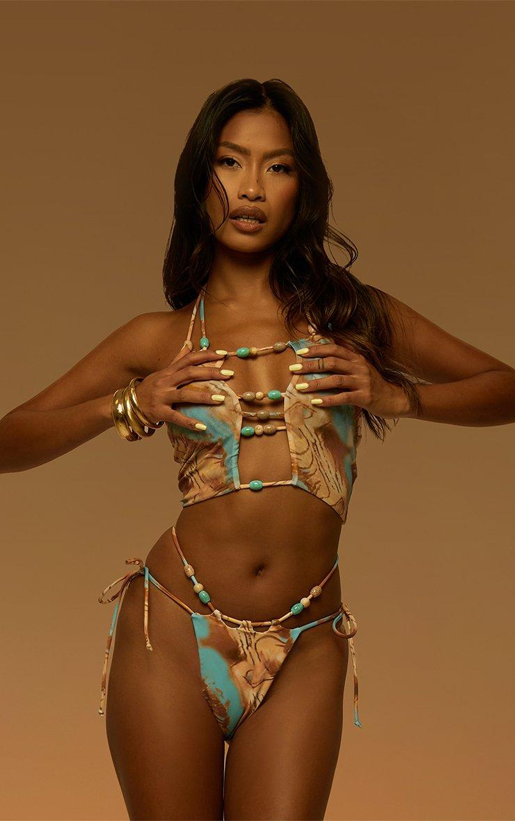 Halterneck Beaded Bikini Top In Green Abstract Print
