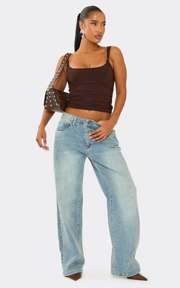 Square Neck Knot Ruched Side Detail Top In Chocolate Brown Slinky