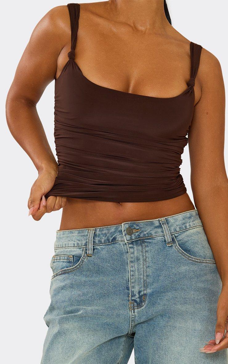 square neck knot ruched side detail top in chocolate brown slinky