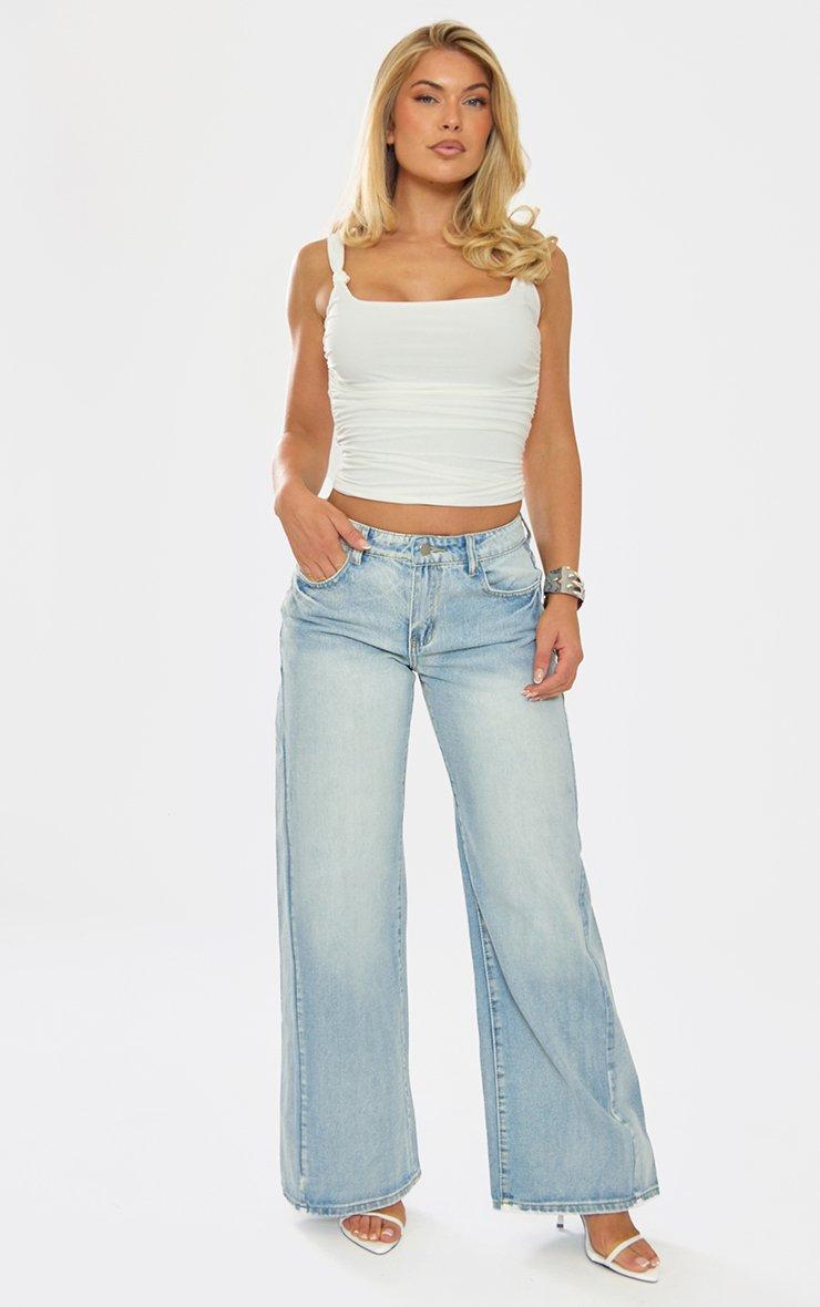 Square Neck Knot Ruched Side Detail Top In White Slinky