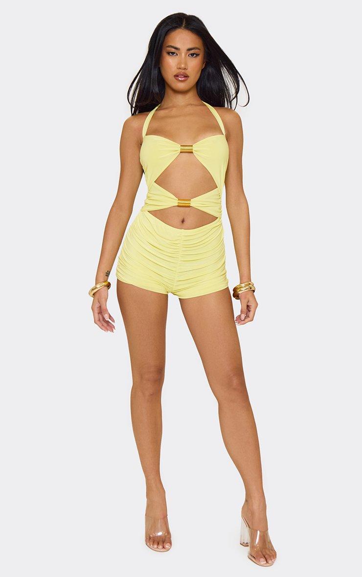 Cross Strap Cut Out Gold Trim Detail Micro Playsuit In Yellow