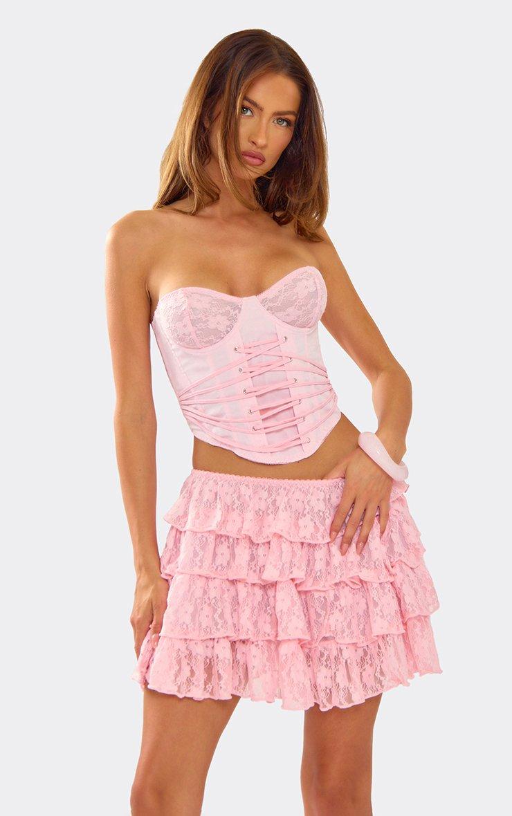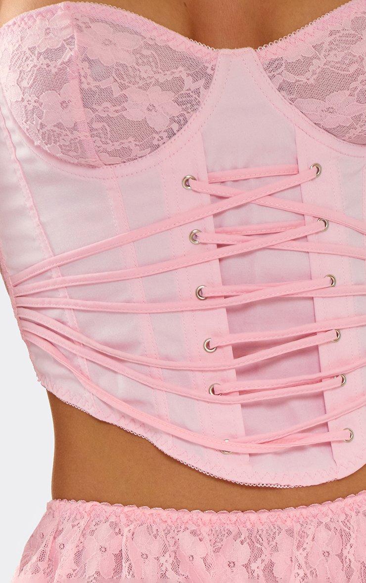 Bandeau Lace Up Strap Detail Corset Top In Pink Lace