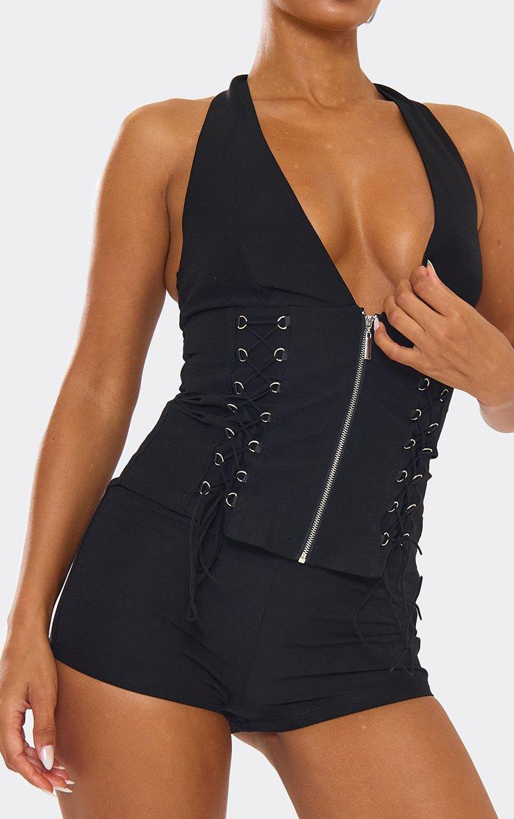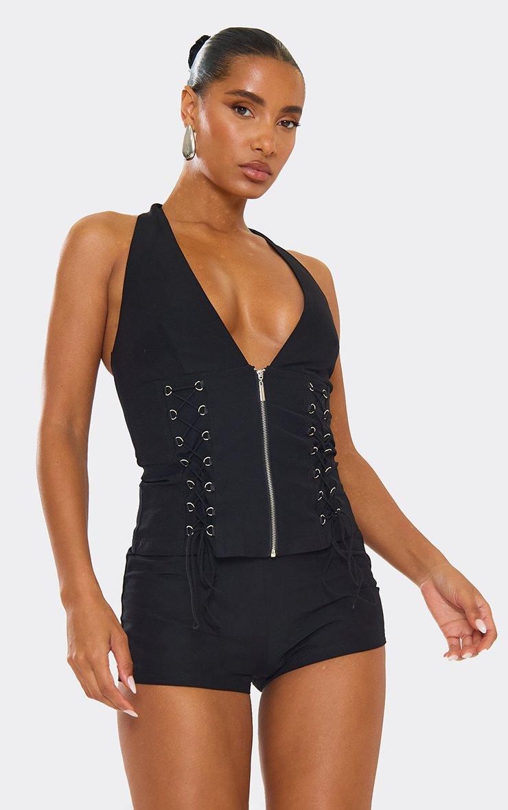 Plunge Halterneck Lace Up Zip Front Detail Top In Black