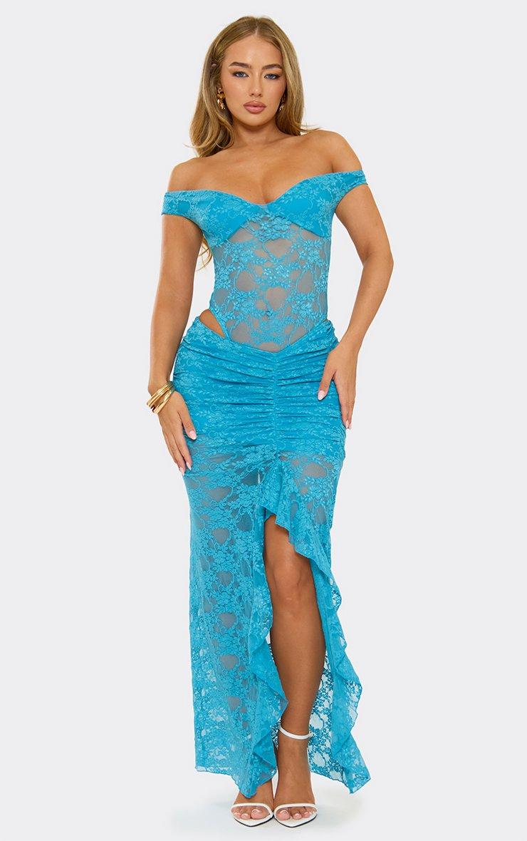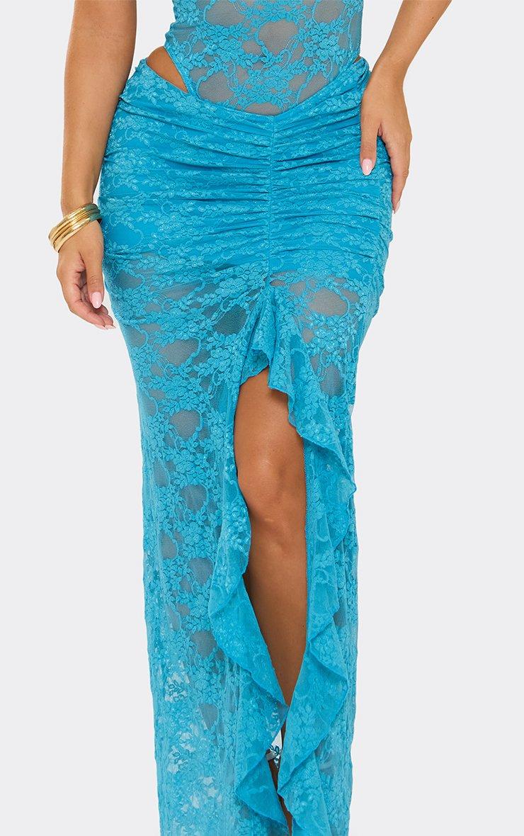 Mid Rise Ruched Frill Split Leg Detail Maxi Skirt In Blue Lace