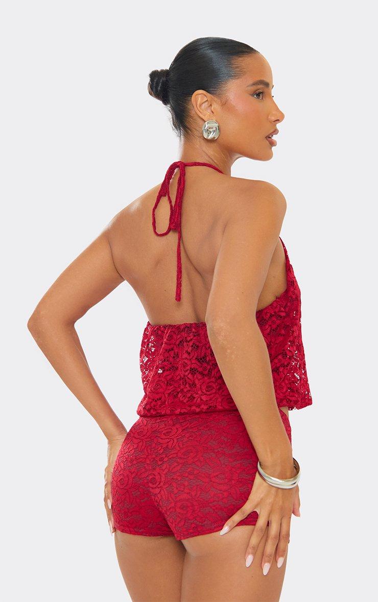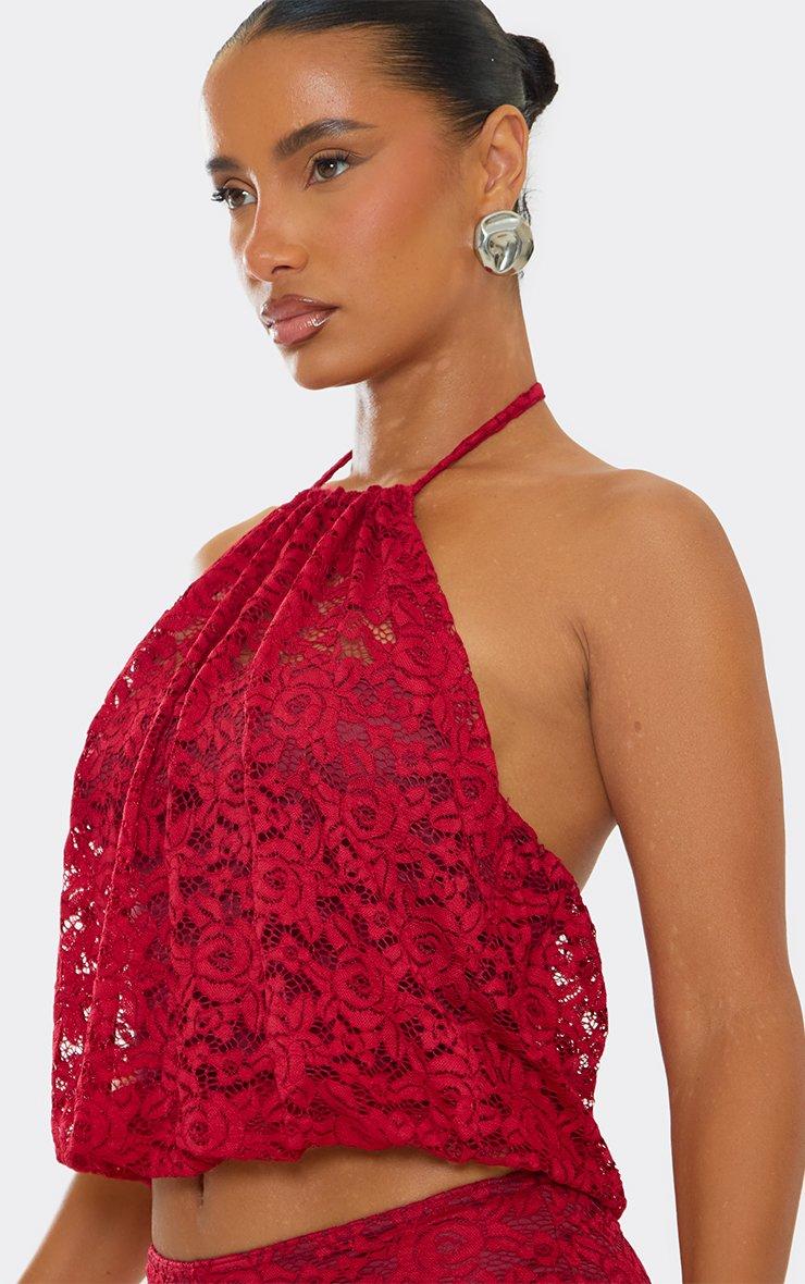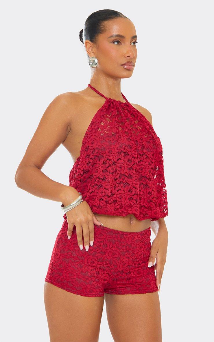 Racer Neck Puffball Detail Crop Top In Red Lace