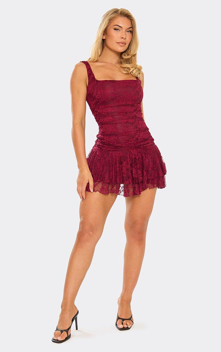 Mesh Cape Overlay Ruched Detail Mini Dress In Burgundy